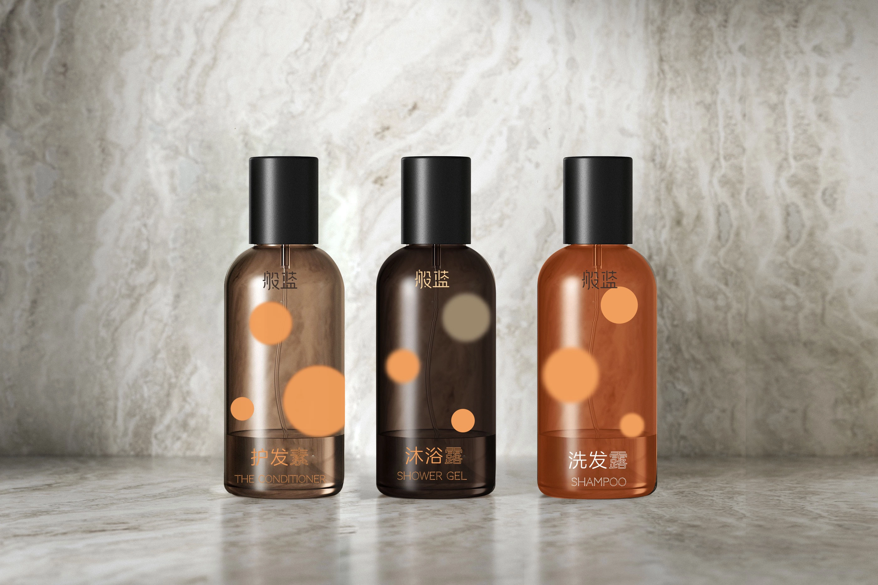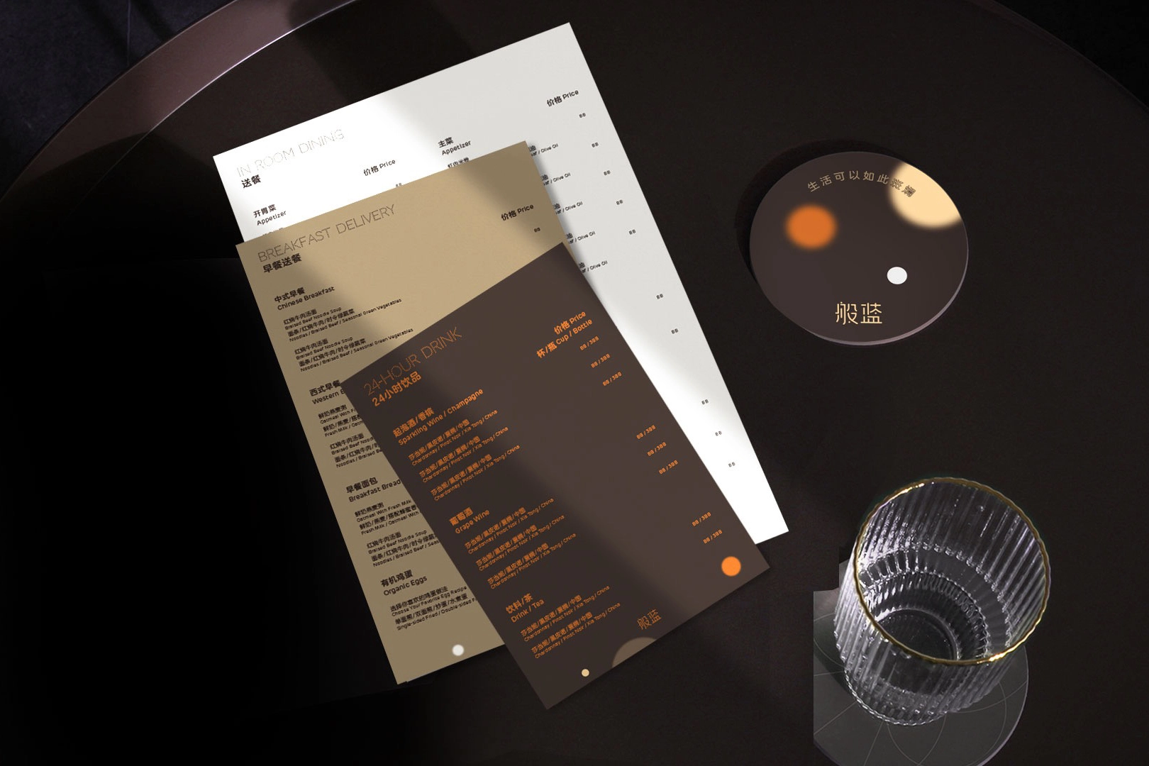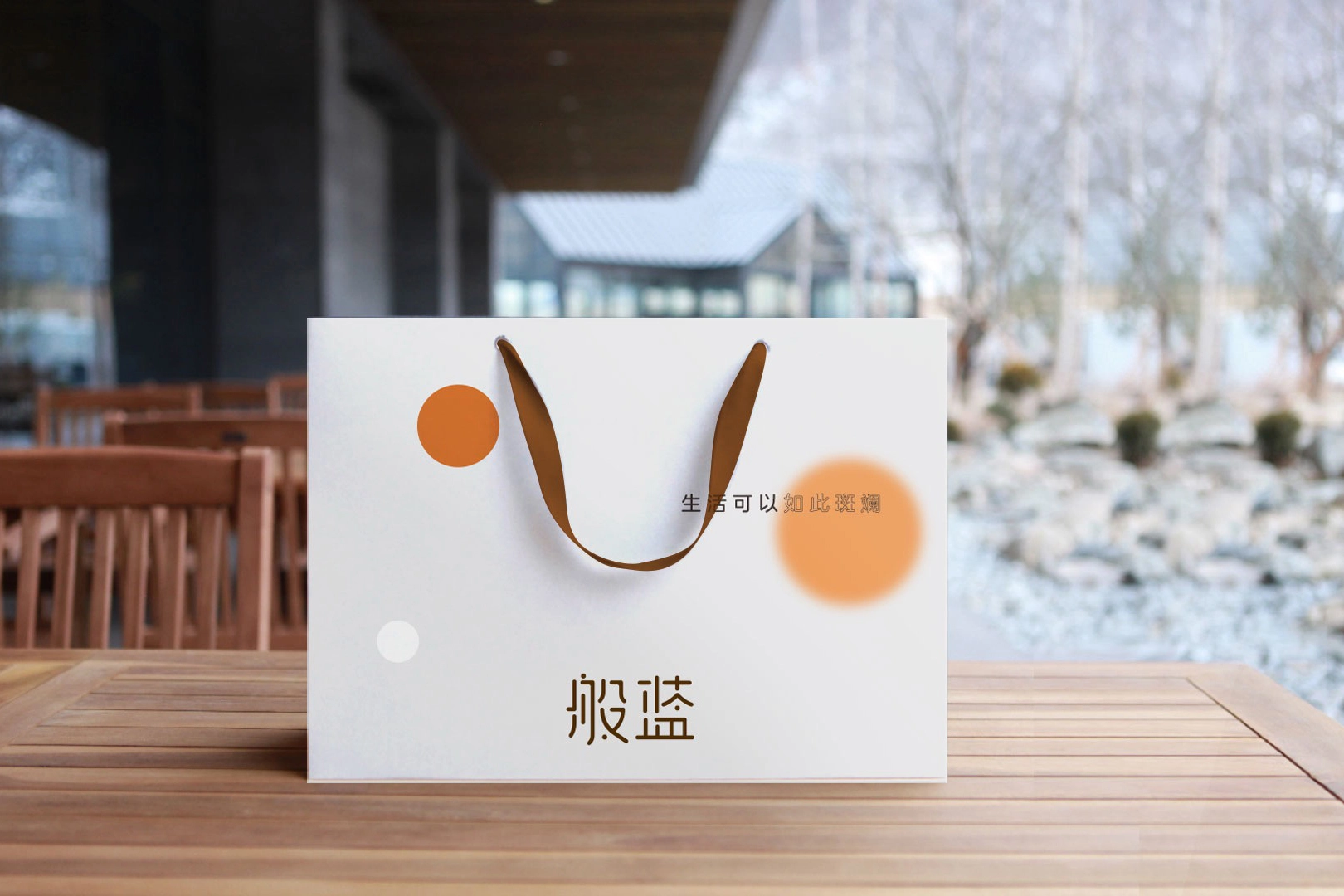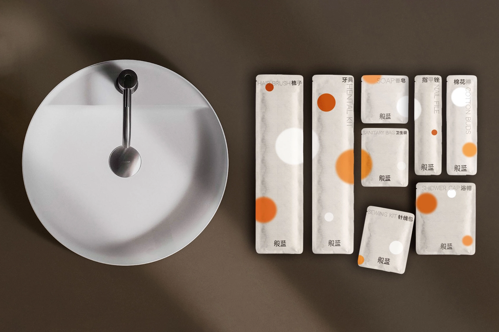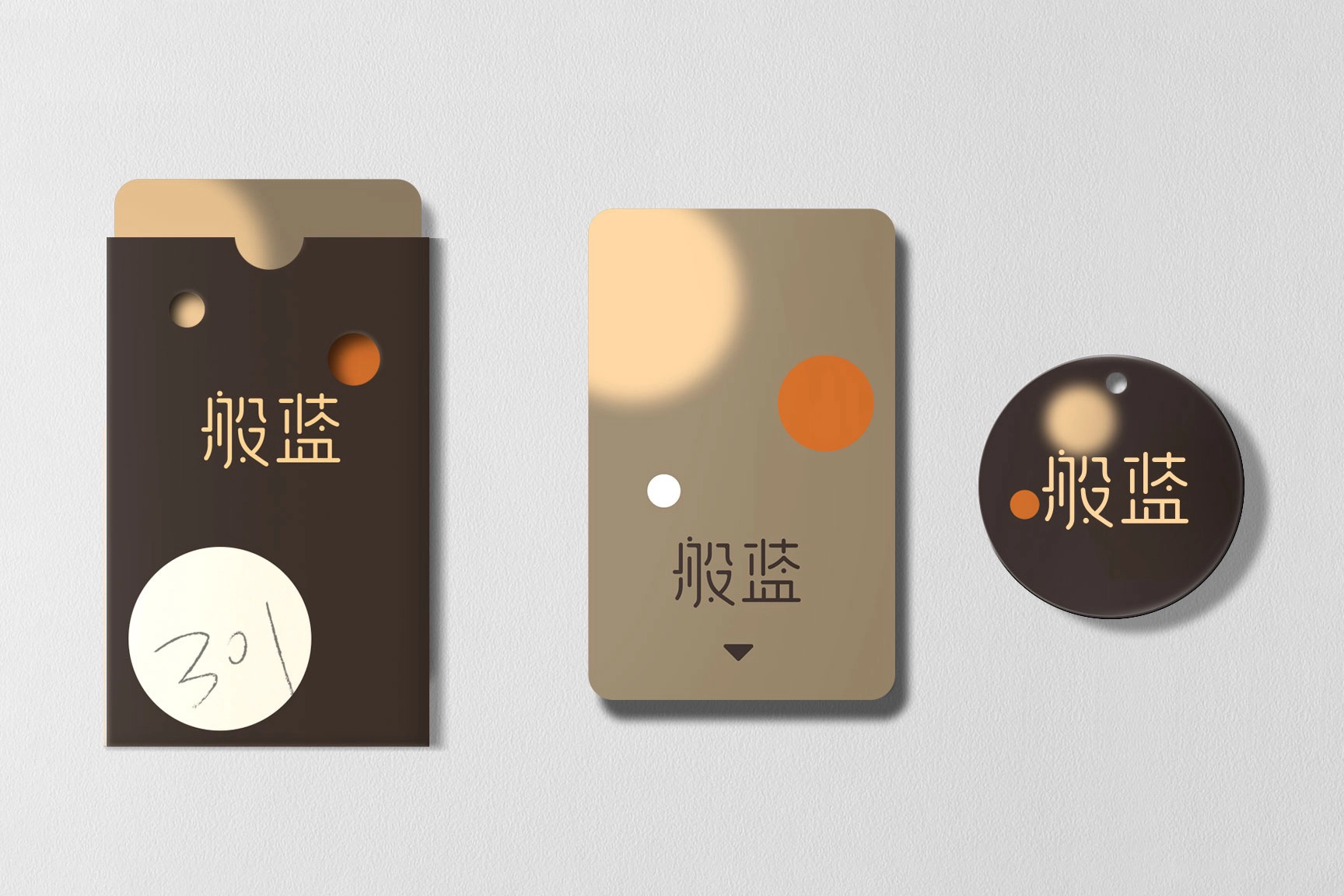 我们设计了般蓝字体作为标识设计,好像沐浴在阳光下的影子,如般蓝舒适的生活般温润闪耀。标志中的三个圆点代表着生活就要五彩斑斓,丰富多彩,它既是标志的一部分,也作为品牌辅助图形贯穿到整个系统中。我们选择了具有东方特色、淡雅的颜色作为般蓝酒店的品牌色。
